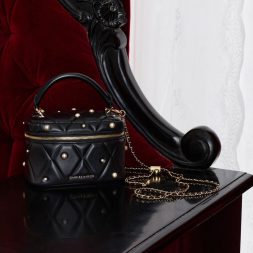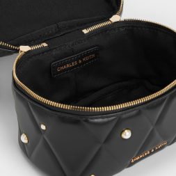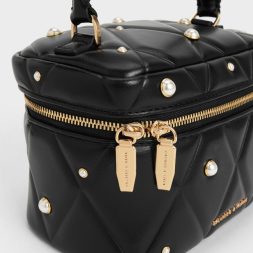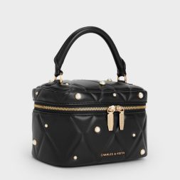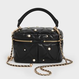 This Arwen vanity bag in black features a quilted finish, scattered pearl embellishments, a top handle and a detachable chain strap. Carry it to bring feminine charm to relaxed jersey pieces and well-worn denim.