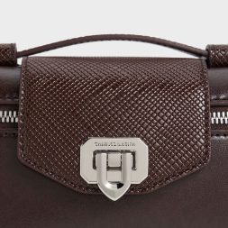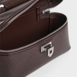 This dark plum Arwen bag evokes the charm of vintage vanity cases with its sleek, boxy shape. Despite its compact size, it boasts remarkable functionality, featuring a top zip-around design that offers ease of access to your essentials and a distinctive push-lock closure that keeps them secure. Whether carried by hand or worn crossbody with the detachable shoulder strap, it presents a stylish and hands-free option for any occasion.