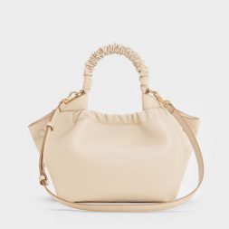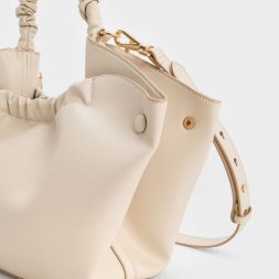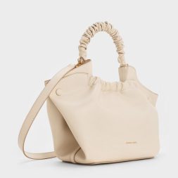 The Eve bag features a slouchy shape perfectly sized to fit everything you need for the day, such as your wallet, cosmetic pouch, water bottle, and portable charger. Although simple in design, the ruched handle and matching magnetic closure add stylish tactility, imbuing it with distinctive flair. Its versatile beige finish will effortlessly complement a wide range of outfits, making the Eve perfect for everyday wear.