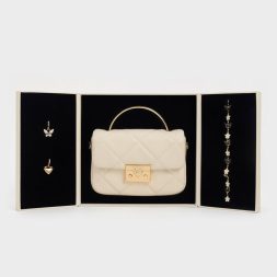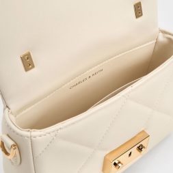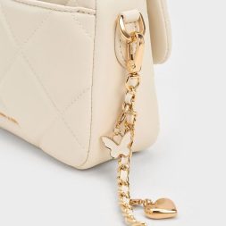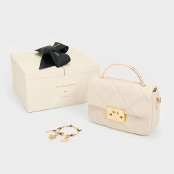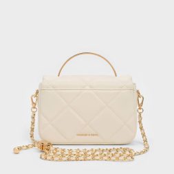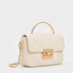 Brighten up your outfits with this classy little bag. The structured top-handle silhouette is softened by a plush quilted texture, which gives the bag a sweet, feminine quality. To introduce a touch of glamour to the design, the metallic top handle and push-lock closure (that comes with a lovely heart detail) adds tasteful shine to the clean cream finish. Use this to tote your date-night essentials in, and attach the adjustable strap to sling it on the shoulder.