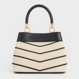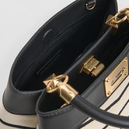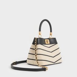 Distinctive yet classic in style, this Eleni top handle bag exudes chic elegance. It features chevron details that incorporate sharp lines into the canvas finish, creating a sophisticated profile. The contrast of black trim against beige is striking yet versatile enough to go with most outfits. Gold-toned accents, like the turn-lock closure, also adds striking touches of shine to the design.
