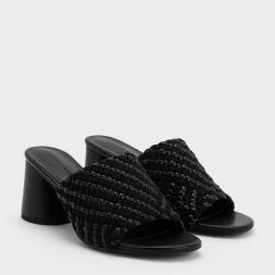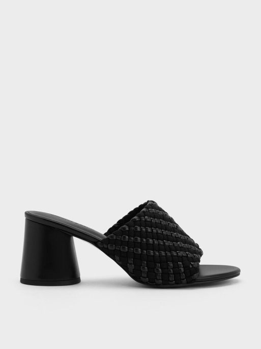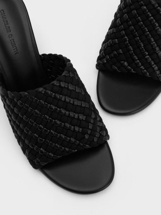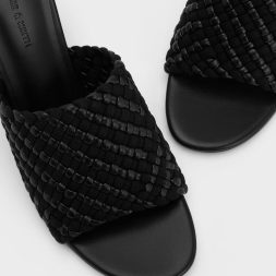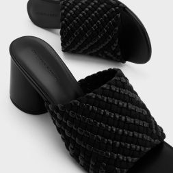 Infuse resort-chic vibes into your everyday look with these mules. The vamps feature an interwoven texture to give the versatile black finish an understated yet distinctive tactility. With its breathable, open-toed design, this elegantly casual style can still be worn dressed up for more formal occasions. Set on sturdy cylindrical heels, they offer a stature boost that will instantly elevate any outfit.