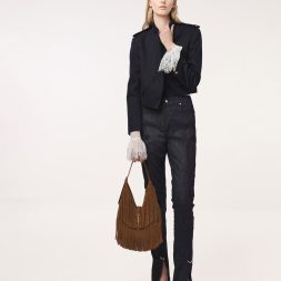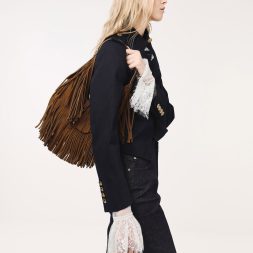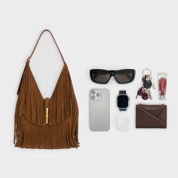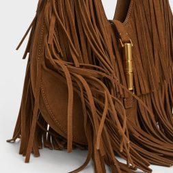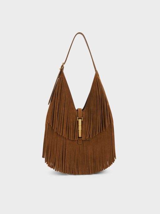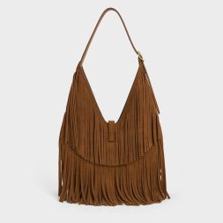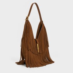 This Cesia hobo bag in brown is made with recycled suede and features a fringed body, a distinctive metallic accent and a single adjustable handle. Carry it to add a statement-making element to your everyday outfits.