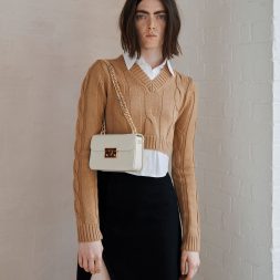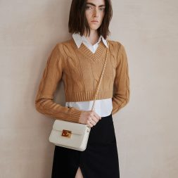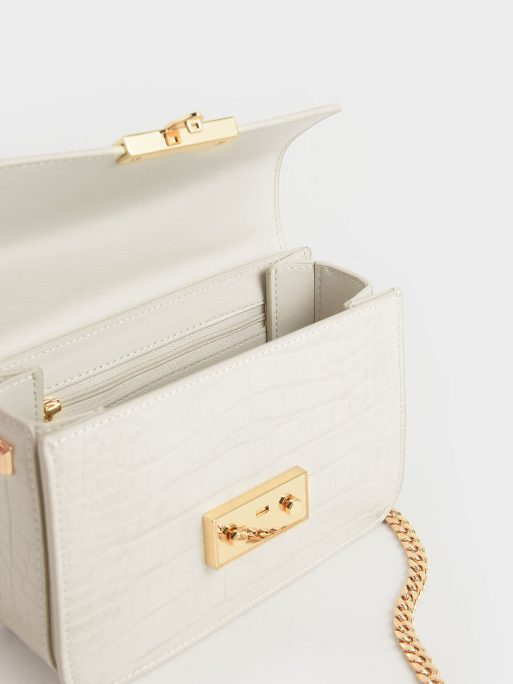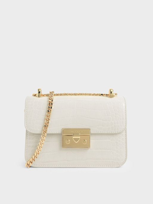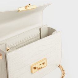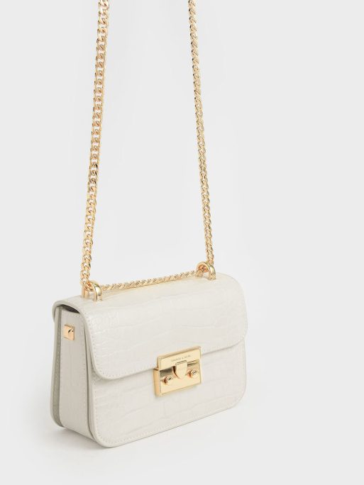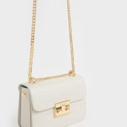 The clean chalk-white shade gives this croc-stamped crossbody understated glamour, while its timeless shape guarantees versatility. Plus, the push-lock closure promises ease of use. Sling this chain strap bag over a little black dress for the perfect contrast.
