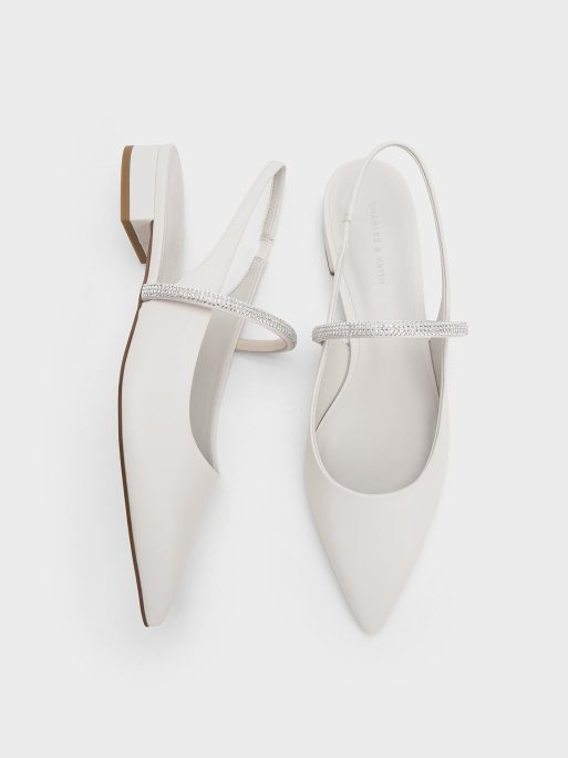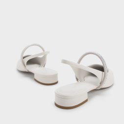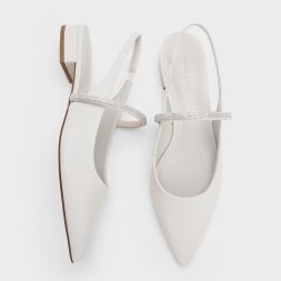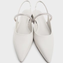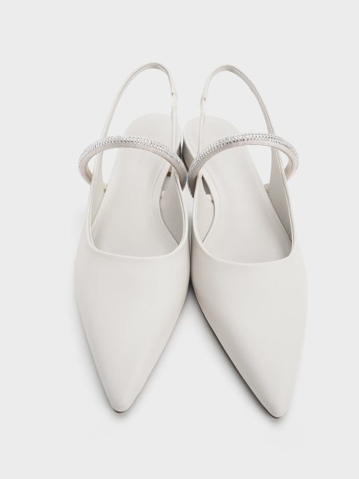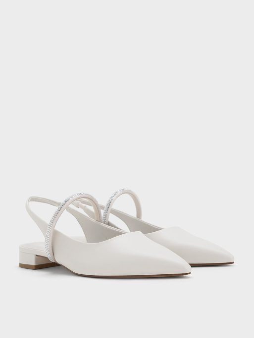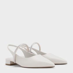 Feminine and chic, these slingback flats are a worthy addition to any wardrobe. The pristine white finish complement the sleek pointed-toed silhouette – this pair&rquos;s elegance is accentuated by dainty slingback straps. As an eye-catching detail, straps across the vamps are embellished with crystals for a glamorous touch. Set on low block heels that provide a subtle stature boost, these flats will add a special touch to your everyday outfits.