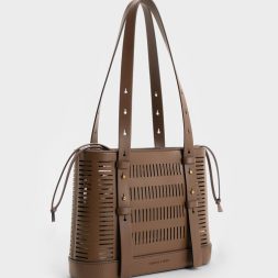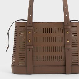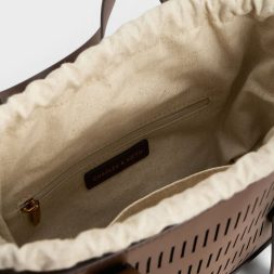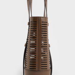 In a beautiful yet understated dark brown, this Delphi is as versatile as any black bag, and a piece that you can easily mix and match with a variety of different outfits. Thanks to the oval cut-out details, the simple bucket bag style has been elevated with visual interest, creating a subtle see-through effect. Bonus points for the thick and adjustable double handles, which allow you to carry the bag at different drop lengths, according to your preference.