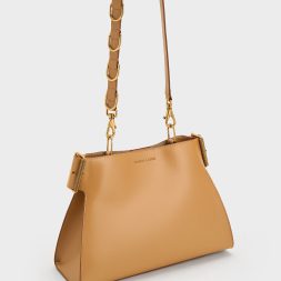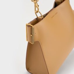 If you are looking to enhance your collection with a distinctive accessory, consider this Lexie bag. Featuring a geometric T-shaped silhouette, it opens up to reveal a structured base that offers ample space for your belongings, easily accessible via the magnetic closure .Upon closer inspection, the buckled accents on the sides showcase unique textured details, making this bag truly one of a kind. For an edgier look, attach the detachable shoulder strap adorned with multiple gold-toned accents to complete your ensemble.