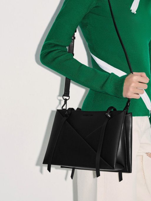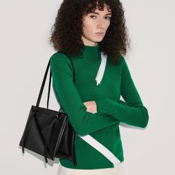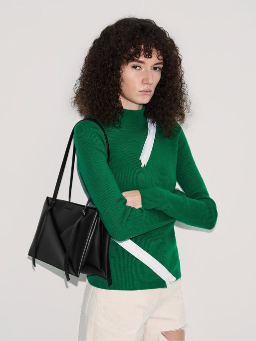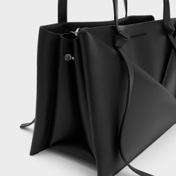 You do not have to sacrifice form for function with this Midori tote. Tasteful details refresh the classic rectangular tote silhouette – geometric folds create swooping, clean lines that tie in perfectly with the sculptural knots on the handles. In a sleek black finish, the bag exudes understated sophistication. Opening up to a roomy interior, it will hold all that you need for the day and more, complete with a secure zip closure. On days when you want to go hands-free, clip on the adjustable strap to carry it on the shoulder. With its nifty versatility, this polished carrier is a great everyday companion.