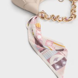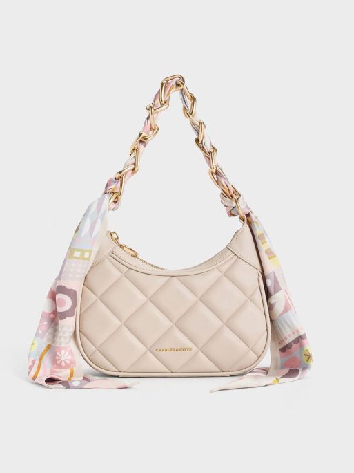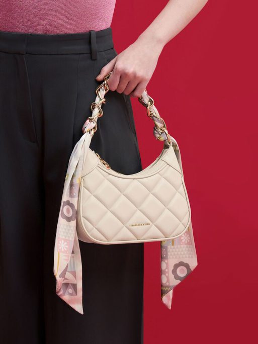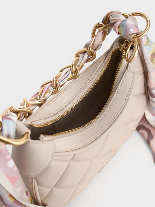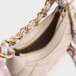 Presenting the newest edition of our Alcott quilted bag. In a creamy shade of oat, it will effortlessly complement any outfit of your choice. The soft, quilted exterior perfectly complements the colourful print scarf that is braided with the chain handle. With a structured silhouette, roomy interior and secure zip closure, this surprisingly spacious bag will be able to hold all your essentials and more.