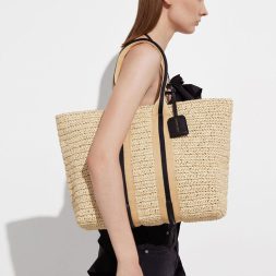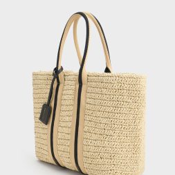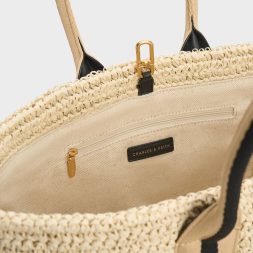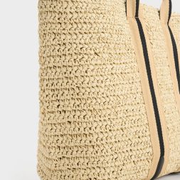 Made for beach days, holidays, and everything in between, this striped handles raffia tote bag arrives just in time for summer. Featuring a visually striking and tactile raffia finish and sturdy straps that feature a striped webbing, this piece is a summer style essential. With a buckle closure that opens up into a roomy interior, keep everything you need by your side with this capacious carryall.