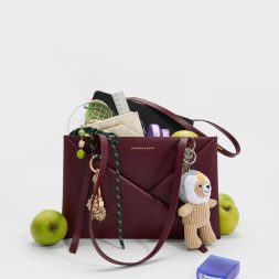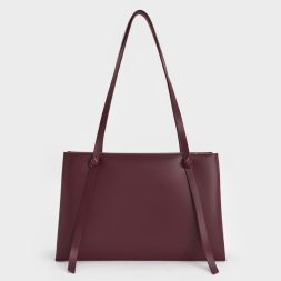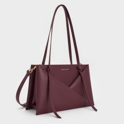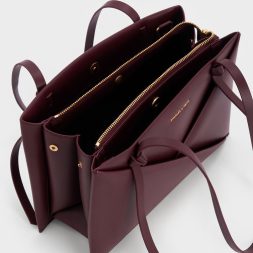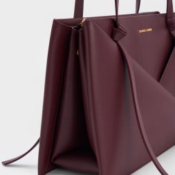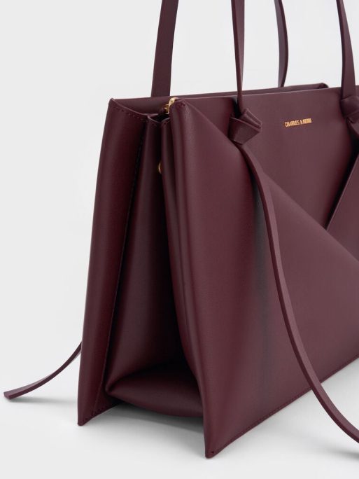 This Midori tote bag in wineberry red features a geometric panelled finish, double handles and a structured body. It will complement minimalist everyday ensembles with its clean lines and sleek details.