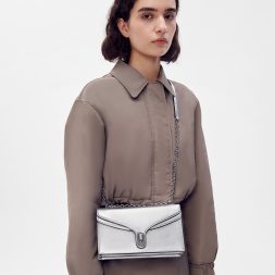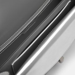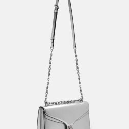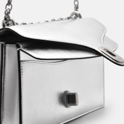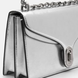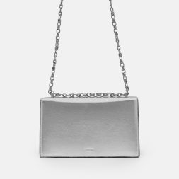 Make a confident statement that exudes feminine charm and contemporary allure when carrying the Elin Shoulder Bag in silver. Its structured boxy shape exudes character, while the envelope flap, secured by a sleek push-lock closure that adds a touch of timeless elegance. The metallic chainlink accent adorns this dressy accessory while an adjustable shoulder strap provides night-long convenience.